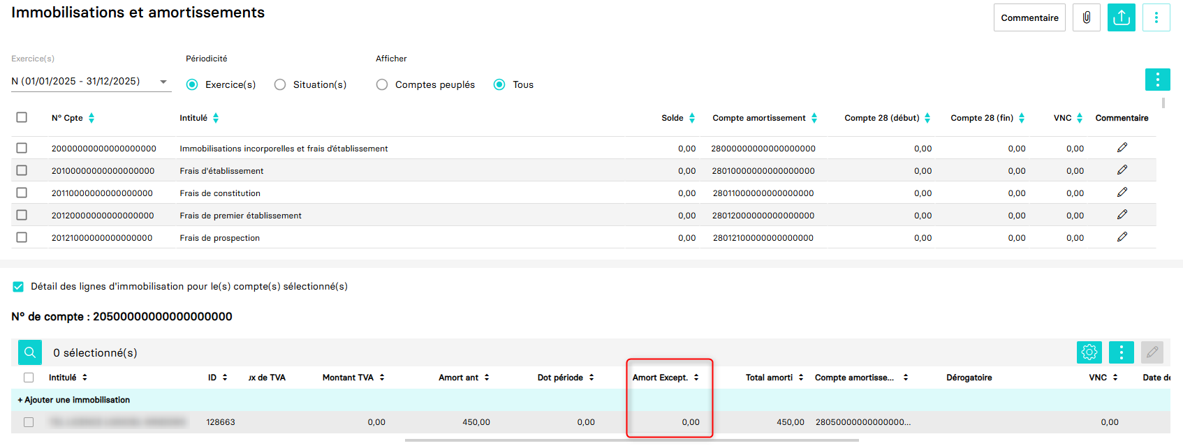 Une nouvelle colonne “Amort Except.” est désormais disponible dans le tableau des immobilisations.