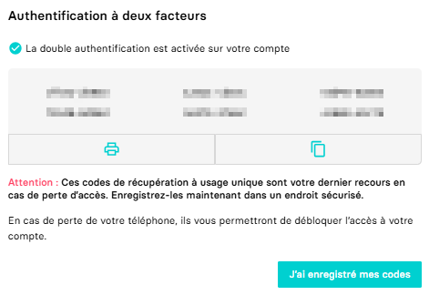 Lors de l’activation, le QR Code et les codes de récupération apparaissent.