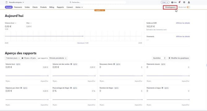 Dans un premier temps il vous faut accéder au Dashboard de Stripe. Pour ce faire, vous pouvez cliquer sur le lien suivant : stripe.com . Arrivé sur le Dashboard, il vous faut cliquer sur le module “Développeurs” en haut à droite de votre écran :