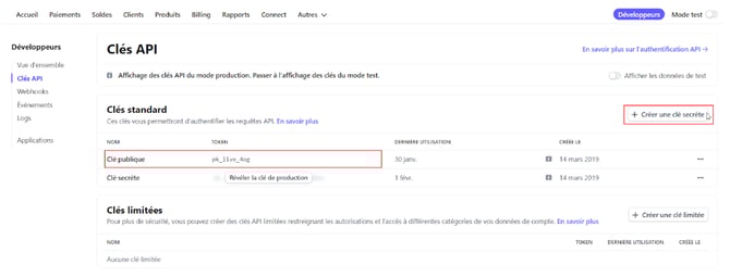 Vous avez à présent accès à votre clé publique directement sur cette page. Afin de générer la clé secrète il vous faut simplement cliquer sur le bouton “Créer une clé secrète” :