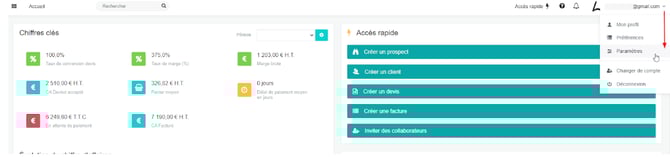 Vous disposez à présent de vos deux clés (Publique et secrète). Pour les synchroniser il va falloir vous connecter à votre application puis, une fois connecté, vous rendre dans le module “Paramètres” :