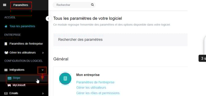 Une fois dans les paramètres dossier, cliquez sur le menu Intégration puis Stripe :