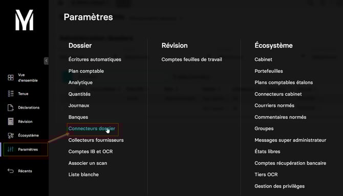Pour cela, connectez-vous au dossier client MyUnisoft puis allez dans le menu Paramètres - Connecteurs :