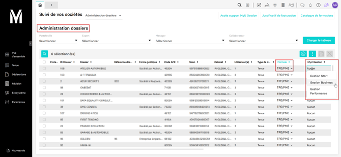 La première étape est de vous connecter à MyUnisoft puis de vous rendre dans le module Administration dossiers (anciennement Admin/EC). Positionnez-vous sur le dossier client où vous souhaitez activer MyU Gestion et vérifiez que ce dossier est bien activé en formule SCI/LMNP ou TPE/PME, puis sélectionnez une formule Myu Gestion (Start, Business ou Performance) dans la colonne « MyU Gestion ».