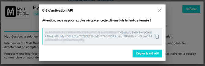 Recherchez et sélectionnez la carte MyU Gestion, sur la fenêtre suivante, cliquez sur le bouton « Générer » pour générer automatiquement une clé API :