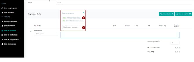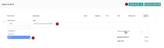 La Gestion Financière vous permet de saisir des notes dans les lignes de texte des documents commerciaux, l’application permet de saisir du texte libre sous forme de titre, de sous-titre et de paragraphe :