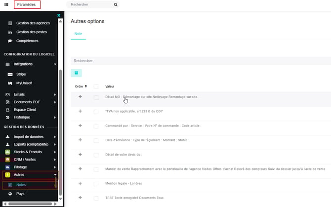 Pour créer des notes préenregistrées, vous devez vous rendre dans le module "Paramètres" de l’application puis dans "Autres" et enfin "Notes" :