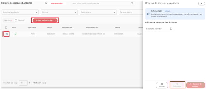 Depuis, Jedeclare, il faut se positionner sur la liste des dossiers, cocher la ligne souhaitée puis "Action sur la sélection", "Recevoir les écritures", indiquer la période.