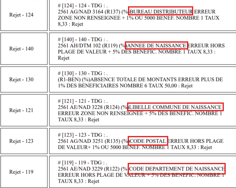 - Rejet lié au type d'envoi (initial ou rectificatif) :